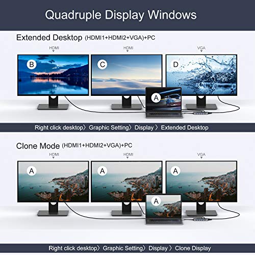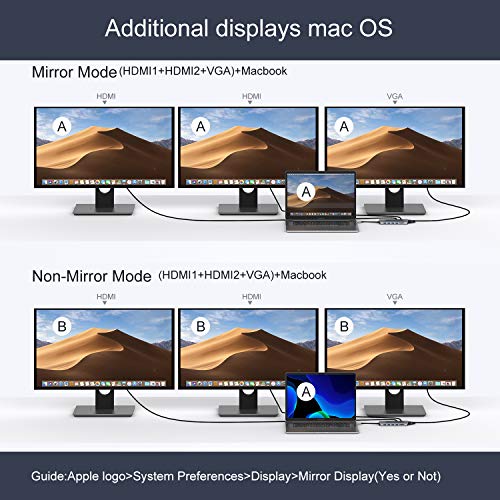 USB C Dual HDMI Adapter: USB C multiport adapter allows you to mirror or extend 3 monitors with 4K HDMI and VGA at the same time which provides you more working space. The max resolution of 2 HDMI: 3840 x 2160@30Hz, VAG port supports maximum 1920*1080 at 60Hz full HD. ***NOTE: Laptop of MacOS just support mirror mode, DOES NOT SUPPORT EXTEND MODE. For extend mode of MacOS laptop, the images of the external monitors will show the same but different from the original laptop.****