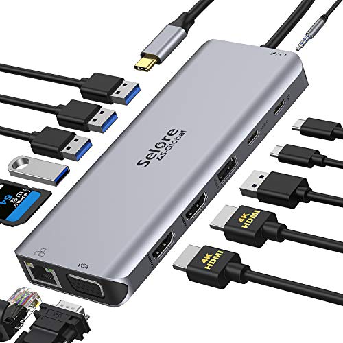 14 in 1 USB C Docking Station: Dual HDMI docking station converts your USB C laptop thunderbolt 3 port to 14 port: 2 x 4K HDMI, 1080P VGA, 3 USB 3.0, 2 USB 2.0, SD/TF card reader slot, 100Mbps gigabit Ethernet, audio, 100w PD and 5Gbps data transfer.