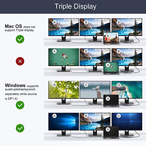 Dual Monitor Docking Station Compatibility: This dell docking station compatible with most USB C ports but not all, PELAE CHECK YOUR LAPTOP HOST SUPPORTS VIDEO OUTPUT OR DP ALT MODE. Laptop docking station compatible with all Thunderbolt 3 devices. Just like MacBook pro 2020 2019 2018 2017, MacBook Air2018 2019 2020, Dell Latitude 13 7000/Latitude 13 E7370, Lenovo Yoga 720/910/920/930, Microsoft Surface Book 2/ Surface Go/ Surface Laptop 3, Dell XPS 13/15, etc, Plug and Play.
