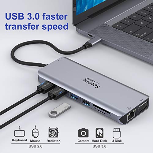SuperSpeed Transfer Speed: This dual monitor adapter comes with 3 USB 3.0, 2 USB 2.0, 1 USB C data transfer port and SD/TF card reader slot. The transfer speed of the USB 3.0 and USB C port up to 5Gbps, connect smartphone, tablet and hard drives. Provide 2USB 2.0, speed up to 480mb/s, allows you to connect keyboard or mouse without any lag. SD/TF card reader allows the transfer of music photos and large files up to 101Mbps.