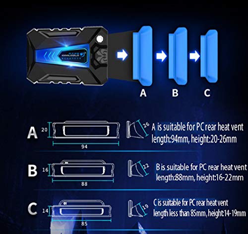*With 3 rubber adapters: A is suitable for PC rear heat vent length:94mm, height:20-26mm. B is suitable for PC rear heat vent length:88mm, height:16-22mm, C is suitable for PC rear heat vent length less than 85mm, height:14-19mm. (Tip: before buying, pls check your pc heat vent size)