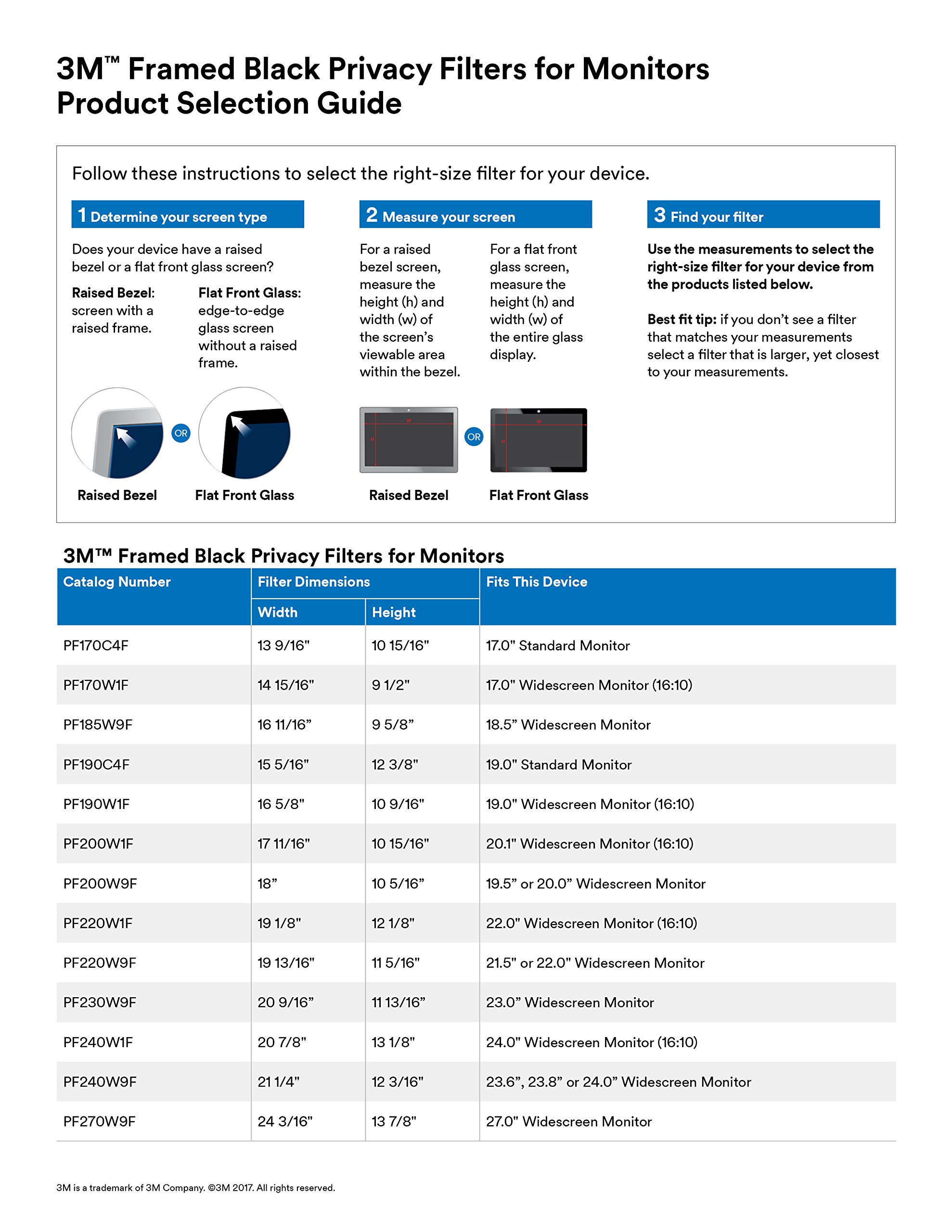 To ensure proper fit, measure the viewable height and width of your screen. (Do not include the screen frame/bezel in you measurement.) Then, choose the filter size that matches your exact measurements, or slightly smaller.